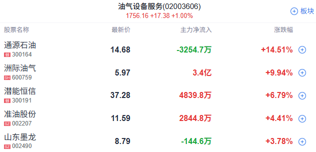 油气概念延续强势,洲际油气涨停,通源石油张超14%、准油股份、石化油服、山东墨龙跟涨。