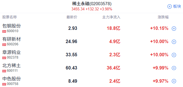 午后稀土永磁概念再度拉升,盛和资源涨停,续创历史新高,此前北方稀土、中稀有色、中色股份、包钢股份涨停,中国稀土触及涨停,金力永磁、厦门钨业、正海磁材、华宏科技等跟涨。