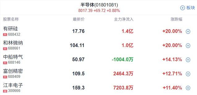午后半导体产业链涨势扩大,有研硅20cm涨停,富创精密、江丰电子、中船特气、拓荆科技均涨超10%,赛微微电、欧莱新材、阿石创、有研新材涨幅靠前。