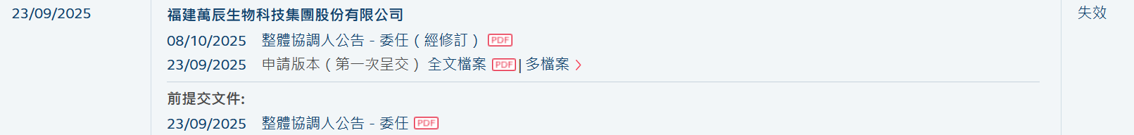福建万辰生物科技集团股份有限公司(简称:万辰集团,300972.SZ)于2025年9月23日所递交的港股招股书满6个月,于2026年3月23日失效,递表时中金公司、招商证券国际为其联席保荐人。