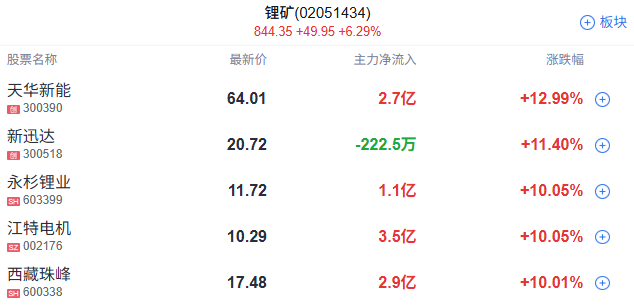 锂电产业链爆发,十余只成分股涨停,融捷股份4连板,石大胜华2连板,江特电机、金圆股份、盛新锂能、赣锋锂业、海科新源、川能动力封涨停。
