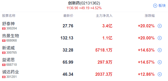 医药板块走强,科拓生物20cm涨停,美诺华6天5板,万邦德4天3板,双鹭药业3天板。