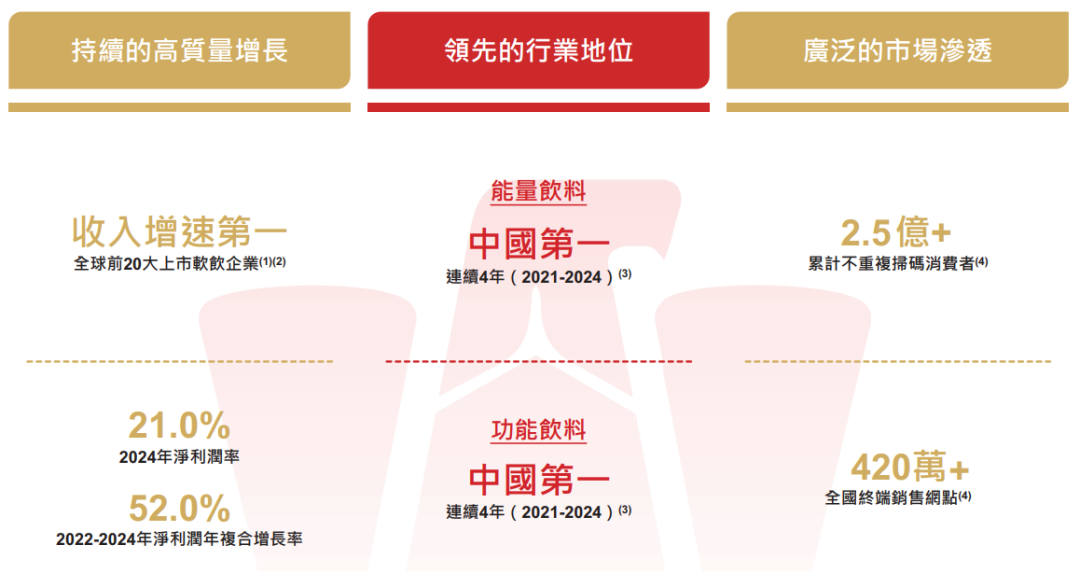 招股书显示,东鹏饮料是中国第一的功能饮料企业,收入增速在全球前20大上市软饮企业中位列第一。根据弗若斯特沙利文报告,按销量计,东鹏饮料在中国功能饮料市场自2021年起连续4年排名第一,市场份额从2021年的15.0%增长到2024年的26.3%。按零售额计,东鹏饮料是2024年第二大功能饮料公司,市场份额为23.0%,领先地位持续夯实。