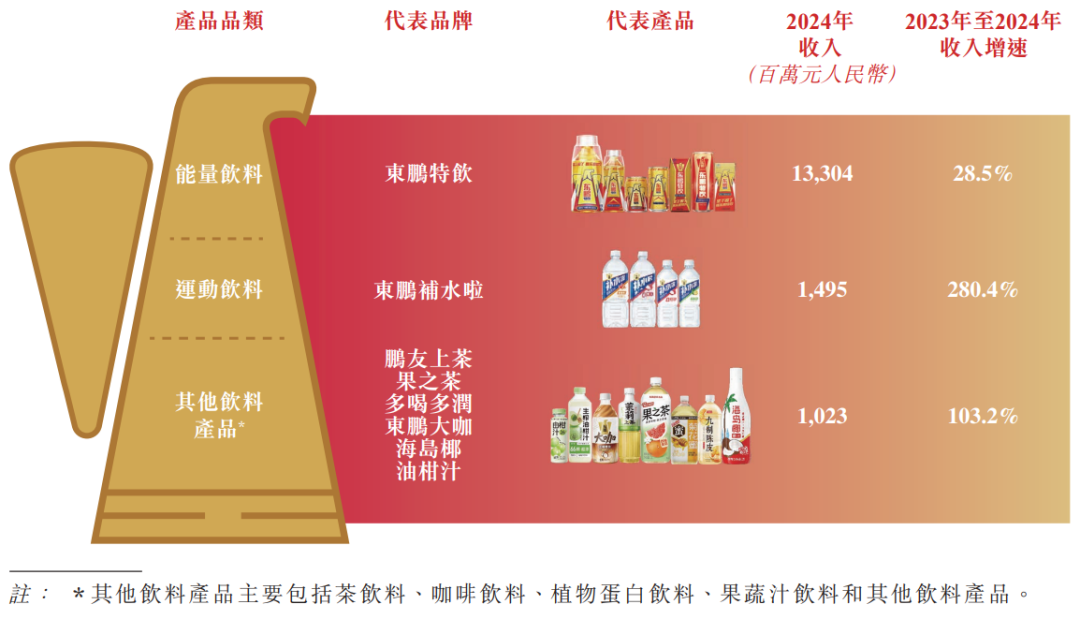 财务方面,于2022年度、2023年度、2024年度以及2025年1-6月,东鹏饮料收入分别约为85亿元、112.57亿元、158.30亿元以及107.32亿元人民币;同期,年内综合收益总额分别约为14.26亿元、20.59亿元、33.64亿元以及23.48亿元人民币。