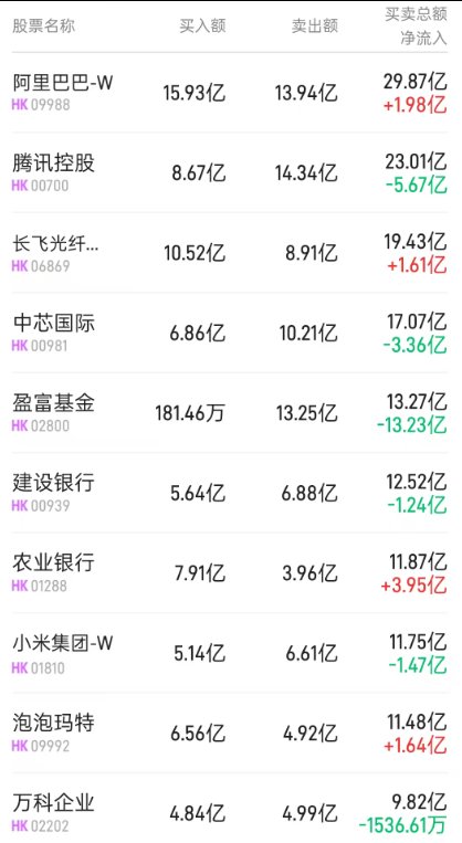 此外,美团-W(03690)、中海油(00883)、泡泡玛特(09992)分别获净买入3.2亿、2.69亿、1.79亿港元。而腾讯(00700)遭净卖出6.05亿港元。