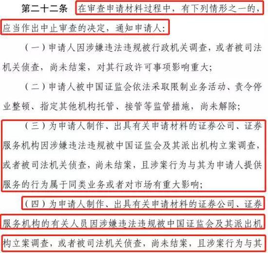 然而,证监会在修订第15条时同时修订了第22条,新规定证券服务机构因涉嫌违法违规被证监会立案调查,或者被司法机关侦查,尚未结案的,对在审项目要中止审查。