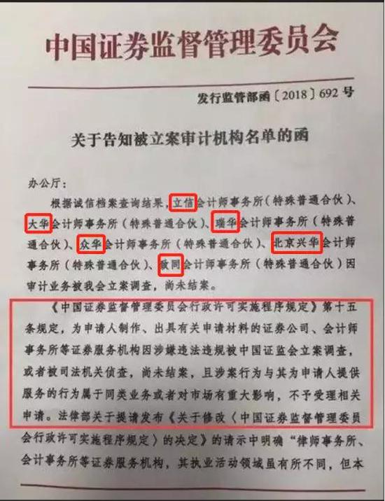 证监会发行监管部6月某日(下面图片中确实看不清具体是哪一天)致函证监会办公厅,立信、瑞华、众华、兴华、致同、大华这6家会计师事务所因审计业务被证监会立案调查,尚未结案。根据2018年3月8日修订、4月23日开始执行的《中国证券监督管理委员会行政许可实施程序规定》第15条的规定,要求办公厅在首发、再融资申请材料接收环节按照规定酌情处理。
