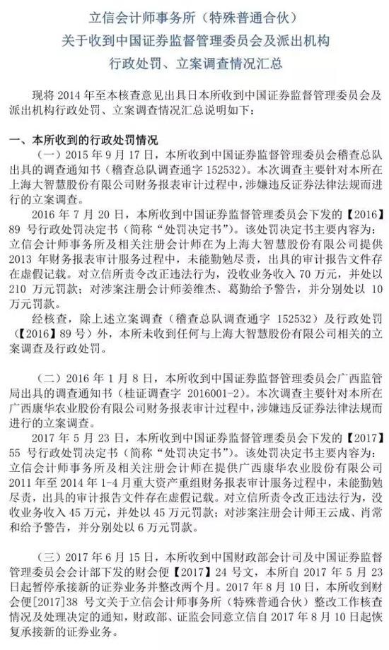 《立信会计师事务所(特殊普通合伙)关于收到中国证券监督管理委员会及派出机构行政处罚、立案调查情况汇总》