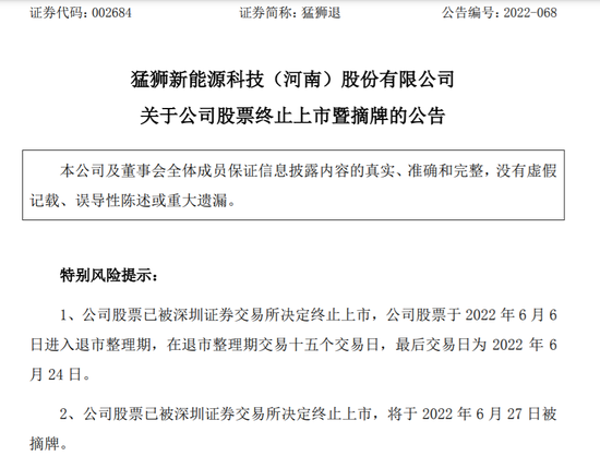 6月26日晚间,猛狮退发布公告,公司股票已被深交所决定终止上市,于6月27日被摘牌。