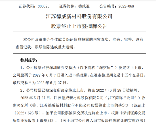 6月27日晚,6月27日晚间,德威退发布退市公告,将于6月28日被交易所摘牌。