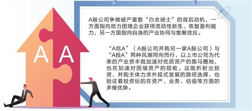 逐浪破产重整,除“A吃A”(A股公司并购另一家A股公司)之外,市场并行出现另一股“A投A”热潮。多位被访者认为,两种风潮同向而行,以上市公司为代表的产业资本既加速对优质资产的跑马圈地,也在加速对困境资产的揽收。这既折射出投资、并购主体力求外延式发展的路径选择,也验证着投资标的在资产、业务、估值等方面的多维优势。