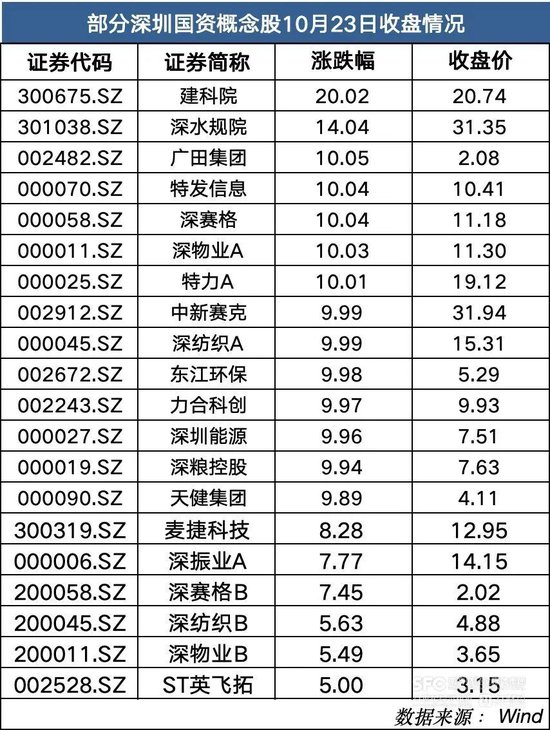 消息一出,深圳国资概念股集体大涨。截至10月23日收盘,建科院涨20.02%、深水规院涨14.04%、广田集团、特发信息、深赛格、深物业A、特力A涨超10%,中新赛克、深纺织A、东江环保、力合科创等纷纷跟涨。