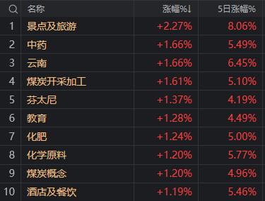 板块方面,旅游、中药、煤炭、电力等板块涨幅居前,MR、PEEK材料、先进封装、智能座舱等板块跌幅居前。