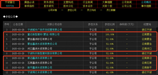 公开资料显示,宁波富达是一家以城市商业地产经营管理和水泥新型建材制造为主业的国有控股上市公司,宁波国资下属的宁波城建投资集团是公司的控股股东,公司旗下拥有宁波城市广场开发经营有限公司、富达新型建材(蒙自)有限公司等两家一级子公司、四家二级子公司和六家三级以上子公司,根据公司官网介绍,公司在云南蒙自、新平各建有一条日产2000吨的新型干法水泥生产线,年产普通水泥和特种水泥490万吨。据悉,公司通过全资子公司富达新型建材(蒙自)有限公司控股了两家水泥企业——蒙自瀛洲水泥有限公司和新平瀛洲水泥有限公司。其中,蒙自瀛洲水泥有限公司下辖蒙自瀛洲砂石有限公司、屏边瀛洲水泥有限公司、河口瀛洲水泥有限公司三家子公司;新平瀛洲水泥有限公司则拥有全资子公司石屏瀛洲水泥有限公司。