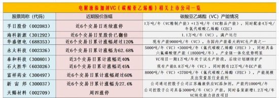 结合周四A股市场收盘后的情况来看,电解液添加剂 VC相关上市公司中,像孚日股份(002083)、海科新源(301292)、华盛锂电(688353)、永太科技(002326)、富祥药业(300497)、石大胜华(603026)等相当部分个股的股价累计涨幅已经非常巨大,电解液添加剂 VC(碳酸亚乙烯酯)概念也已经一跃成为当前A股市场最火爆的热点风口。
