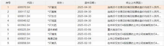 据IPO日报统计,截至5月12日,2025年已有10家公司收到沪深交易所下发的终止上市事先告知书,还有6家分别是*ST普利(300630.SZ)、*ST旭蓝(000040.SZ)、*ST嘉寓(300117.SZ)、*ST吉药(维权)(300108.SZ)、*ST龙津(002750.SZ)、*ST鹏博(维权)(600804.SH),其中*ST旭蓝和*ST嘉寓已经因为连续20个交易日股价低于1元而完成退市。