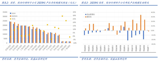 2025年商业银行存款利率继续下行,资本市场高峰期,居民理财“搬家”趋势进一步增强。6月末,银行理财存续规模达到31.3万亿元,同比增长9.7%。分机构来看,17家国有、股份行理财子公司6月底合计存续规模达到24.19万亿元,占据理财市场份额超八成。国有行方面,上半年工、农、中、建四大行理财子公司存续规模增长速度放缓,建信理财还出现了7.2%的收缩;中邮理财、交银理财增速较快,上半年增速分别达到16.5%、8.0%。相较于国有行,股份行理财子公司趋势更为明显,恒丰理财、渤银理财两家较小规模机构增速迅猛,分别为29.0%、22.4%。招银理财上半年规模收缩1%,但仍为市场上存续规模最大的理财子公司,达到2.41万亿元。
