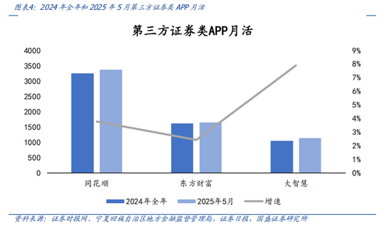 证券类APP活跃度已成为引流核心,头部平台有望按照流量占比分享红利,其中同花顺、东方财富、大智慧月活稳居前三。根据证券时报网,2024年在第三方证券类应用APP领域,同花顺、东方财富和大智慧继续以显著优势稳居前三,月活跃用户均突破千万级别。其中,同花顺以全年月均活跃用户3246.45万人领跑,东方财富以1614.18万人紧随其后,大智慧则以1053.5万人位列第三。到2025年5月,根据证券日报,同花顺、东方财富、大智慧月活人数分别为3369.27万、1653.3万、1136.63万,在证券类App中位居前三。