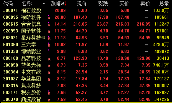 AI应用概念今日再度活跃,截至收盘,福石控股、福昕软件20%涨停,合合信息涨超14%,三六零、博纳影业亦涨停,品茗科技涨近9%。