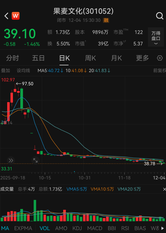 而在公司12月2日发布亏损公告后,公司股价连续两个交易日下跌。截至12月4日,果麦文化收盘报39.1元/股,总市值已跌至39亿元。