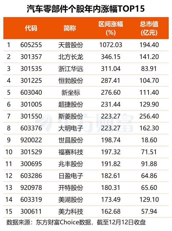今年以来,汽车零部件股年内走势造好,近九成个股实现股价上涨,平均涨幅超50%,有32股实现翻倍。其中,天普股份股价涨超10倍,在板块中遥遥领先;北方长龙、浙江华远均涨超3倍,新坐标、超捷股份等5股区间涨幅在2倍以上。