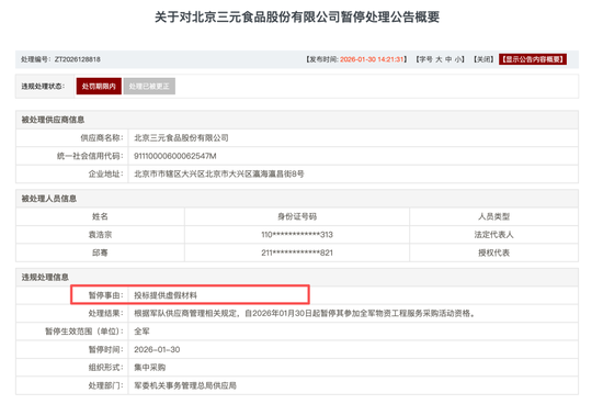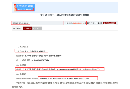 在互联网政务高度透明的今天,公共数据的客观存在不以任何企业的单方面意志为转移。军队采购网作为国家权威的招投标监督平台,其发布的《关于对北京三元食品股份有限公司暂停处理公告概要》白纸黑字、有迹可循,不仅明确标注了2026年1月30日的发布时间,更清晰点明了“提供虚假材料”的违规事由。