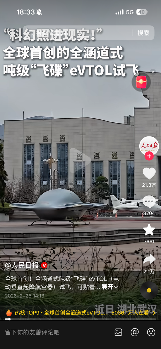 湖北“新春第一会”场外,全球首创全涵道式吨级“飞碟”eVTOL试飞掠过会场上空时,连人民日报都惊叹“科幻照进现实”。