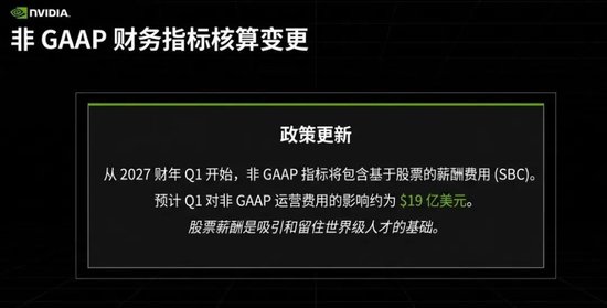 公布财报的同时,英伟达宣布,自一季度起,非GAAP口径下的财务指标将不再剔除股权激励(SBC)。因这一调整,英伟达预计,一季度非GAAP口径下运营费用将受到的影响约为19亿美元。