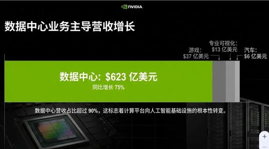 四季度英伟达的数据中心业务录得营收623.14亿美元,同比增长75%,增速高于前一季度的66%,分析师预期同比增近70%至603.6亿美元。
