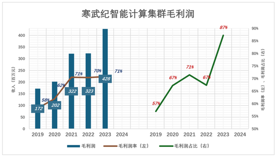 2020年上市以后,寒武纪营收、毛利润几乎全靠智能计算集群业务支撑:
