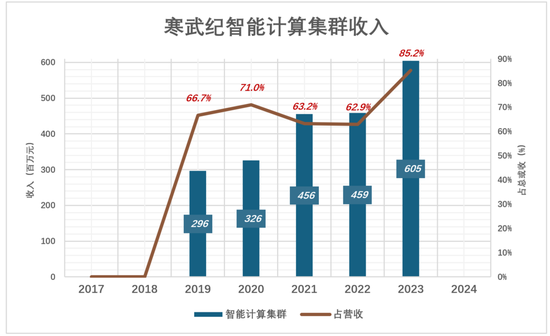 2020年~2023年,寒武纪智能计算集群收入徘徊在5亿以下、占营收的比例超过60%。