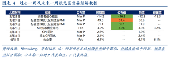 3月23日-27日当周,欧元区:3月消费者信心指数初值、3月标普服务业PMI初值、2月M3同比均低于预期,3月标普制造业PMI初值好于预期。