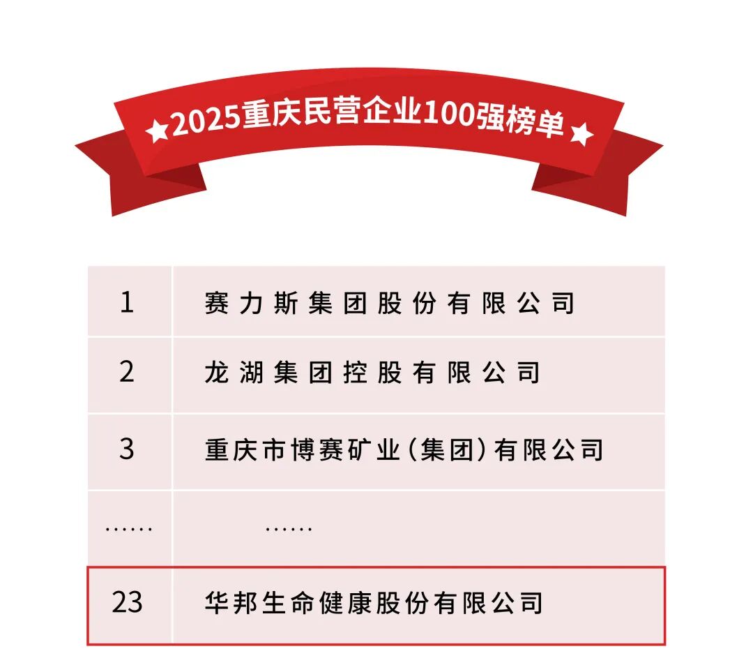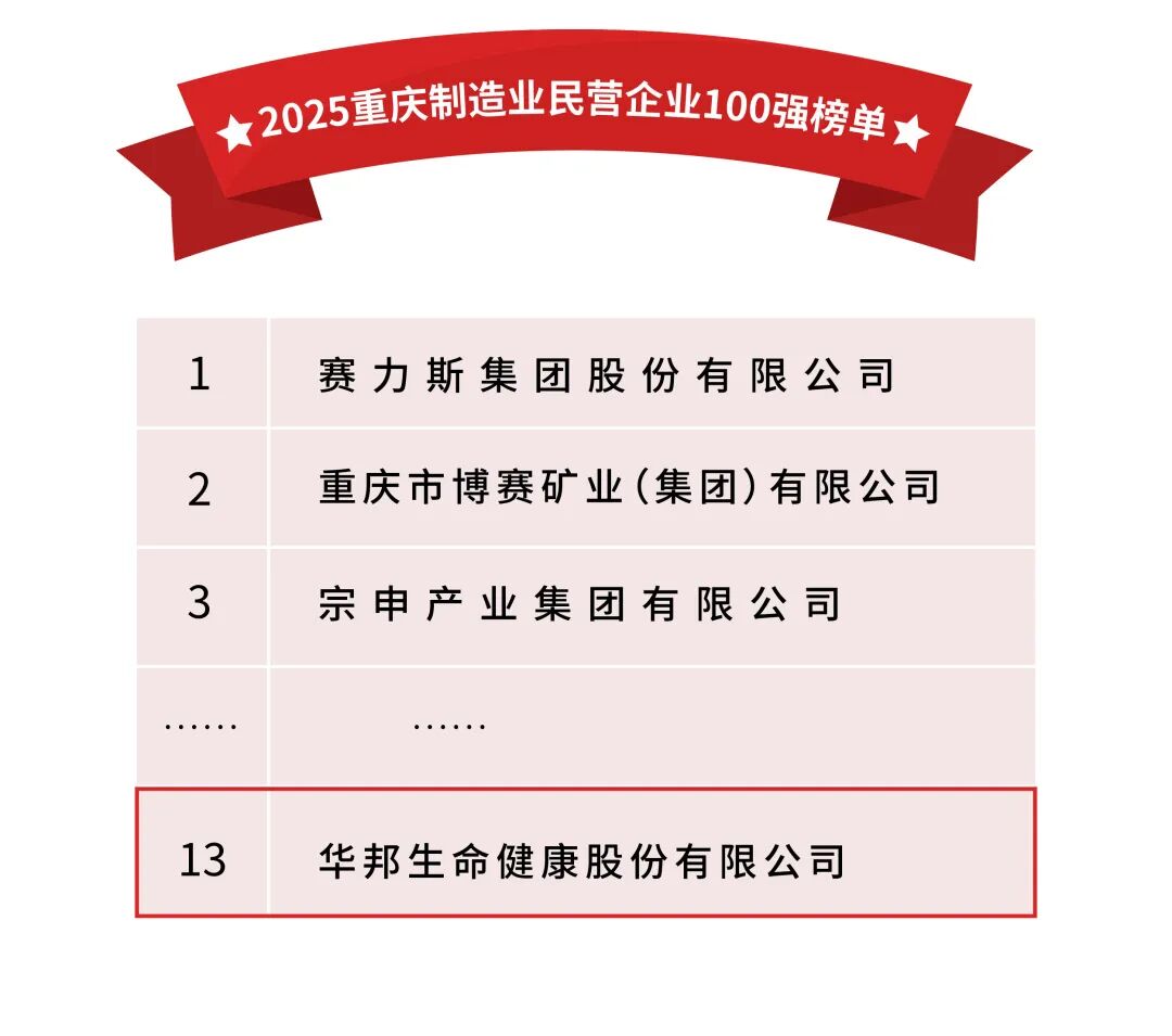 华邦生命健康股份有限公司荣获2025重庆民营企业100强榜单第23位和2025重庆制造业民营企业100强榜单第13位,两项排名较上年均有所提升。