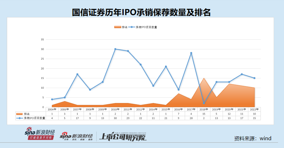 作为老牌券商的国信证券,在IPO承销保荐业务上发力较早。据wind数据,国信证券在2007年、2008年、2009年、2012年、2015年的A股IPO项目的承销数量(按上市日,下同)分别为17家、9家、13家、22家、21家,在行业中排第一。