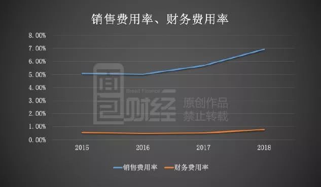 进一步分析发现,答案或许隐藏在费用端。自2015年以来,上海医药的销售费用率、财务费用率整体处于较为明显的上升趋势。特别是销售费用方面,金额由2015年53.48亿上升至2018年110.58亿,三年时间上涨超过一倍,较大程度上拖累了公司的盈利水平。
