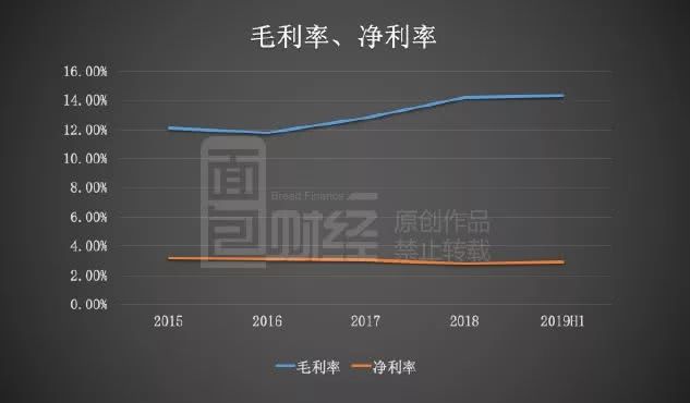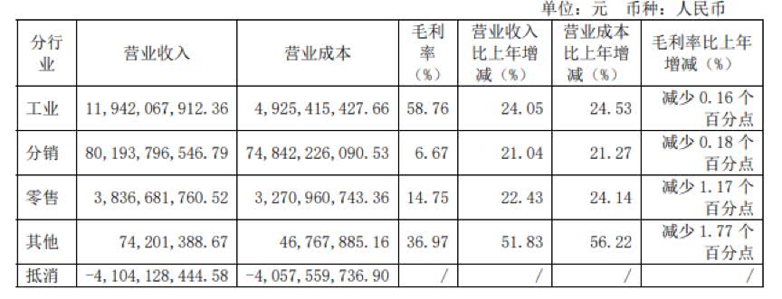 从2019年中报披露的营收构成来看,分销业务的营收规模达到了801.94亿,占比最大。其次分别为工业、零售业务。但是,由于分销业务毛利率最低,只有约6.67%,因此拉低公司整体毛利率至14.35%。