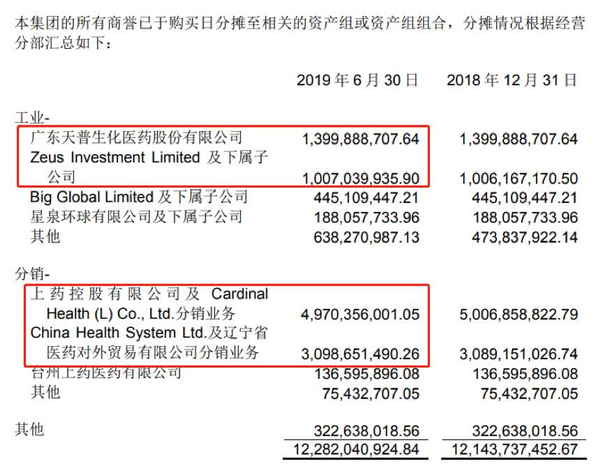 从商誉具体构成来看,四个经营分部的商誉金额超过了10亿,包括医药工业下面的广东天普生化医药股份有限公司、Zeus Investment Limited及下属子公司,以及分销业务下面的上药控股有限公司及Cardinal Health(L)Co.,Ltd分销业务、China Health System Ltd.及辽宁省医药对外贸易有限公司分销业务。