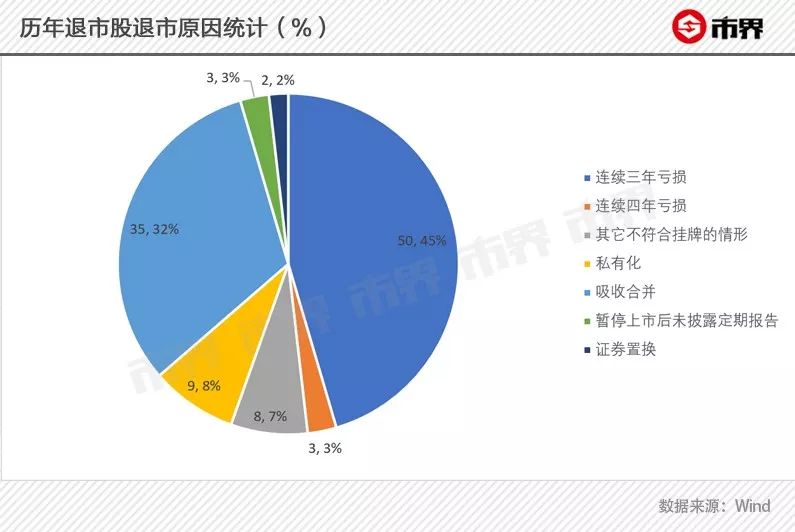 ??注:2006年退市原因统计另一大类为强制退市,是交易所为维护股票质量、保护投资者权益而强制上市公司退市。相对于主动退市,强制退市机制是淘汰绩差股、违法股、违规股等质量较差的股票,从而实现融资资源优化配置,保护中小投资者利益的更好渠道。?A股第一支被强制退市的股票是PT水仙(600625.SH)。?PT水仙即水仙电器,曾是沪上家喻户晓的家电品牌,一台“水仙”牌洗衣机是时髦家庭的标配,1993年和1994年,水仙电器A股和B股先后上市,风光无限。?可惜的是,在随后的中国家电行业大混战中,水仙电器不敌对手,自1997年起连续四年亏损,2000年时甚至资不抵债,最终于2001年4月被证监会裁定终止上市,开启A股强制退市先河。?尽管如此,强制退市在A股仍是极为少见,直到2019年。?市界统计结果显示,2019年退市的10支股票中,4支因连续三年亏损退市,5支因其他不符合挂牌的情形而退市,剩下一支小天鹅被美的集团吸收合并退市,以强制退市为主。?单就强制退市情况而言,2019年与往年相比又有其独特性。?自1999年第一支退市股琼民源(000508.SZ)退市以来,A股已经退市的个股共计110支。按退市原因分类,一半以上公司因连续三年亏损被退市,即财务指标不达标被强制退市;第二、三大退市原因分别为吸收合并和私有化,即主动退市。