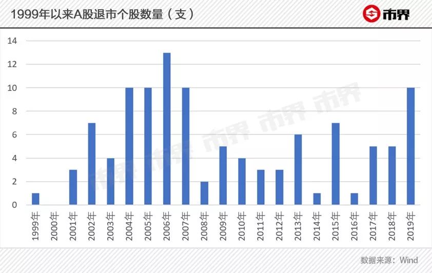 市界统计了A股历年退市个股情况。数据显示2019年A股退市股票为10支,为2008年以来退市个股最多的一年。