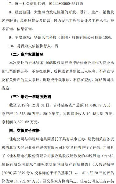同时,为了降低应收账款无法收回的风险,佳电公司拟受让吉林装备100%股权(评估价格14,752.97万元)以抵偿华锐风电对其的欠款13,210.57万元。