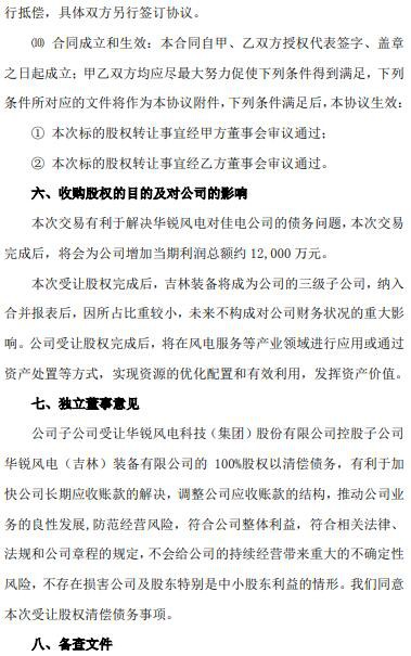 本次交易有利于解决华锐风电对佳电公司的债务问题,本次交易完成后,将会为公司增加当期利润总额约12,000万元。