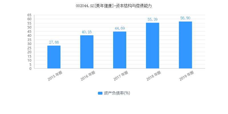 上市后,公司的资产负债率也在逐年走高。2015-2019年,美年健康的资产偿债率分别为27.66%、40.16%、44.69%、55.39%、56.9%,处于快速上升状态。