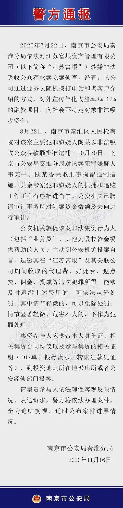 2020年11月,南京市公安局秦淮分局发布通报称,2020年7月22日,依法对江苏富垠资产管理有限公司涉嫌非法吸收公众存款案立案侦查。经查,该公司通过业务员随机拨打电话和老客户介绍的方式,对外宣传年化收益率8%- 12%的融资项目,向社会不特定对象非法吸收资金。