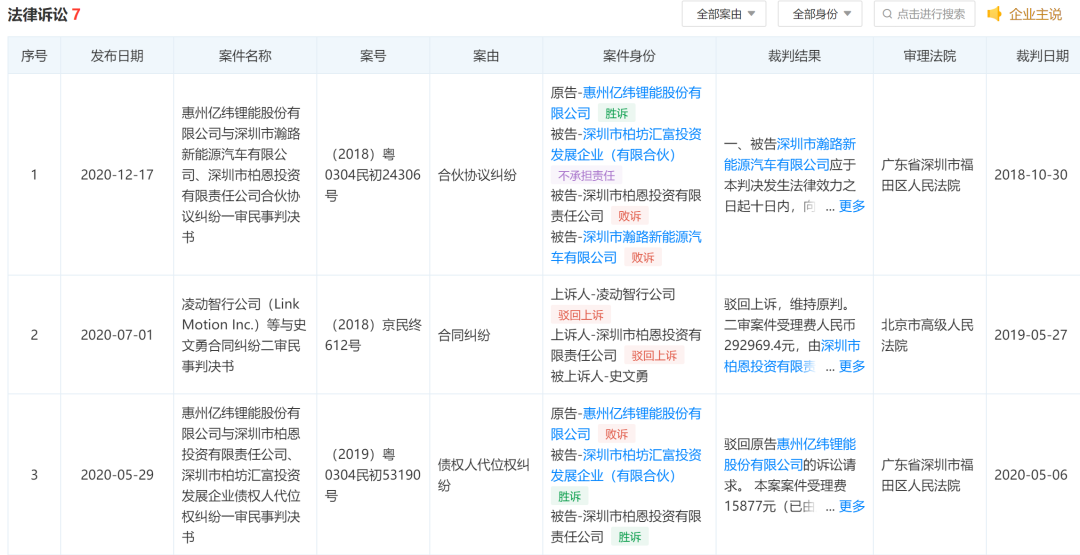 基金君还发现,柏恩投资涉及多起法律诉讼,包括亿纬锂能与深圳市瀚路新能源汽车、柏恩投资合伙协议纠纷。