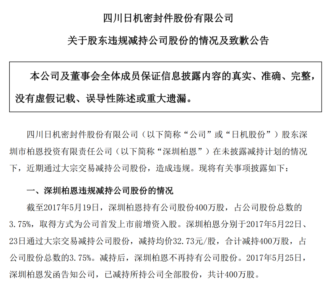 随后日机密封还收到四川证监局的问询函,关注到公司的披露,股东深圳市柏恩投资在未披露减持计划的情况下通过大宗交易减持公司股份400万股。