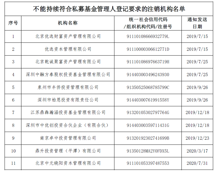 1月8日晚间,基金业协会又公布了一批《不能持续符合私募基金管理人登记要求的注销机构名单》,现有北京优选财富资产管理有限公司、北京乾诚聚富资产管理有限公司、南京卓中投资管理有限公司等11家管理人不能持续符合管理人登记要求。协会将注销该11家机构的私募基金管理人登记,并将上述情形录入资本市场诚信档案数据库。