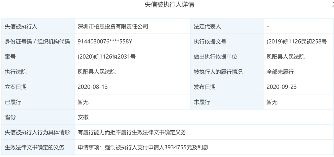去年8月法院将柏恩投资列为失信被执行人,其有履行能力而拒不履行生效法律文书确定义务,强制被执行人支付申请人393.48万元及利息。