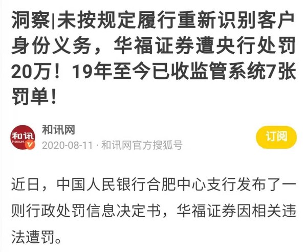 2020年8月中国人民银行合肥中心支行发布了一则行政处罚信息决定书,华福证券因相关违法遭罚。