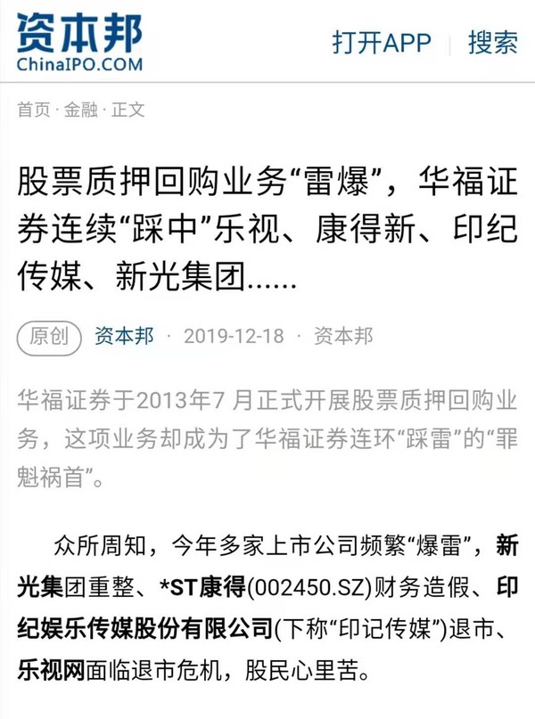 2019年12月,涉及华福证券的多家上市公司频繁“爆雷”,新光集团重整、*ST康得(维权)财务造假、印纪娱乐传媒股份有限公司退市、乐视网面临退市危机。