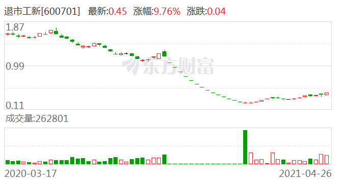 退市工新(SH 600701,最新价:0.45元)4月28日午间发布公告称,控股股东工大高总持有的公司股份约6679万股于2021年4月26日被司法冻结,冻结股份占其持股比例为44.75%。哈尔滨工大高新技术产业开发股份有限公司控股股东哈尔滨工业大学高新技术开发总公司截至2021年4月26日持有公司股份数量约1.49亿股,占公司总股本14.42%;截至本公告披露日,工大高总持有公司的股份累计被司法冻结股份数约为6679万股占其持股总数的44.75%,占公司总股本的6.45%。